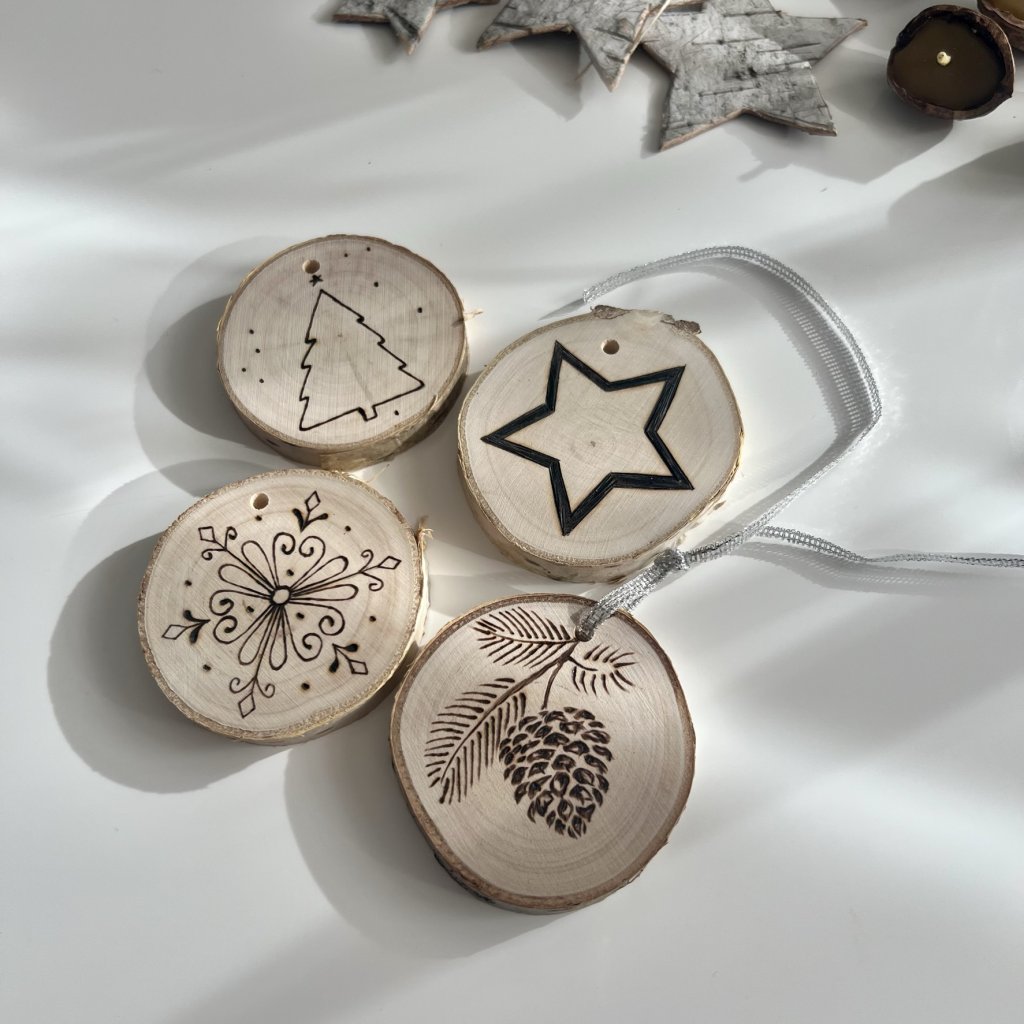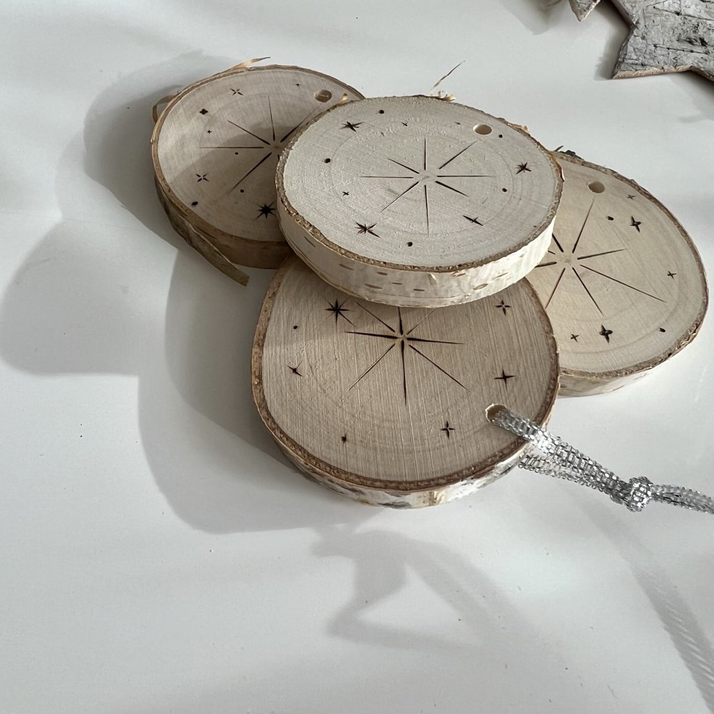 Závěsná vánoční dekorace. Můžete si ozdobit větvičky ve vázičce nebo použitelné jako přírodní ozdoba na vánoční stromeček. Kolečka jsou vypálená oboustraně na jedné straně je vánoční motiv a na druhé straně jsou hvězdičky.