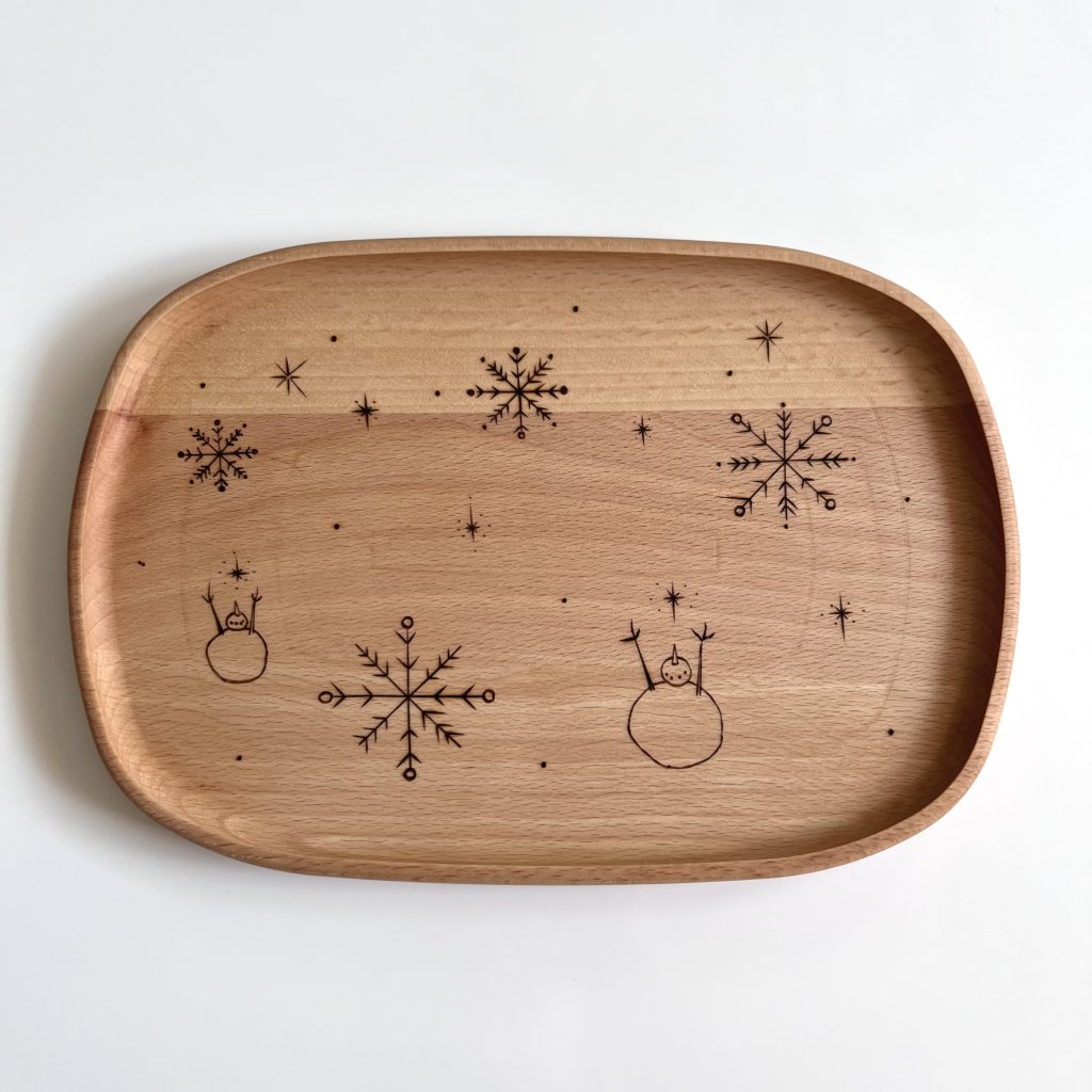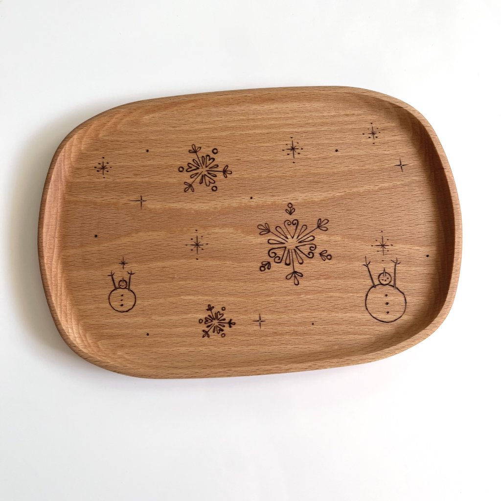 Dřevěný tác s motivem sněhuláčků, kteří patří k zimnímu období.
